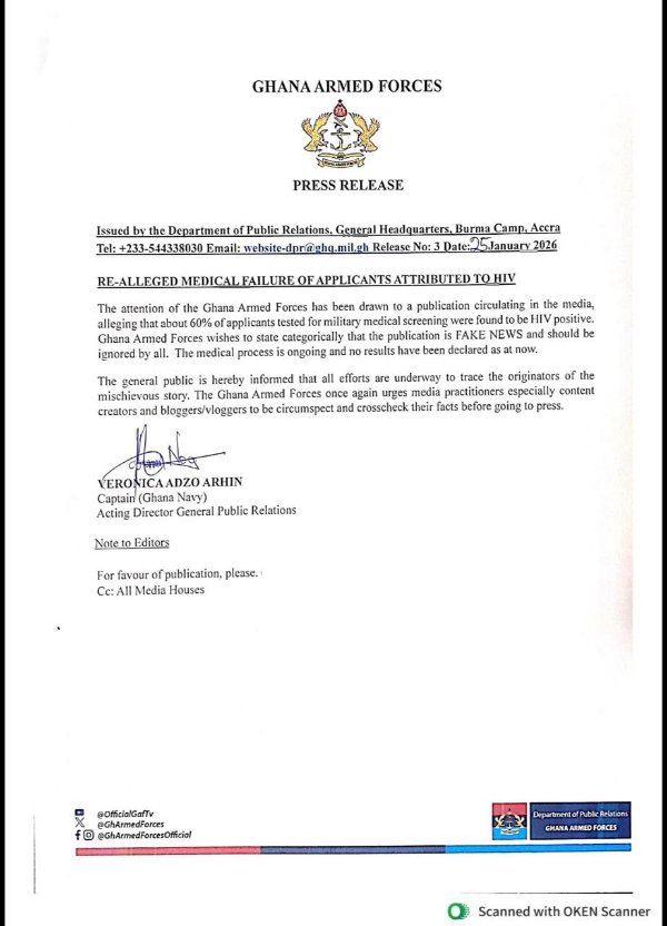 "The attention of the Ghana Armed Forces has been drawn to a publication circulating in the media, alleging that about 60% of applicants tested for military medical screening were found to be HIV positive.