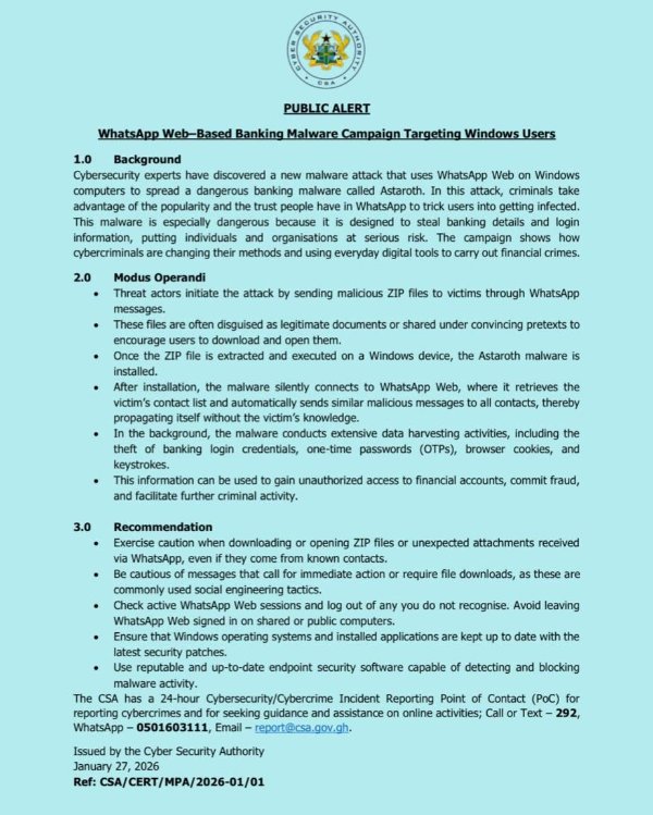The Cyber Security Authority (CSA) has issued a public alert warning of a banking malware campaign that uses WhatsApp Web to target Windows users. In light of this threat, the CSA urges individuals and organisations to exercise heightened caution.