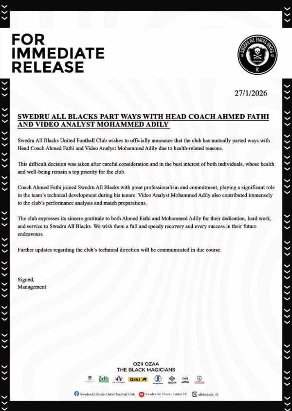 Swedru All Blacks United Football Club has officially announced that it has mutually parted ways with Head Coach Ahmed Fathi and Video Analyst Mohammed Adily due to health-related reasons.
