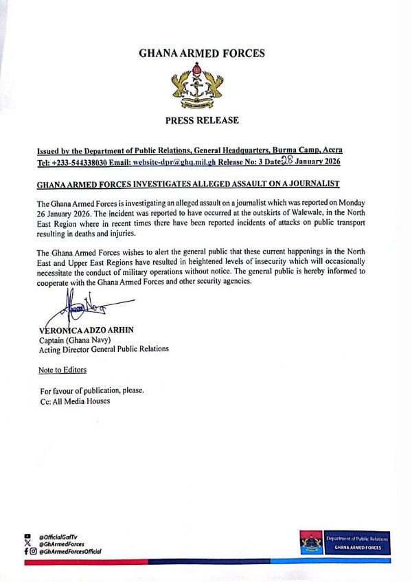 The Ghana Armed Forces (GAF) has announced it will investigate an alleged assault on a journalist reported on Monday, January 26, 2026.