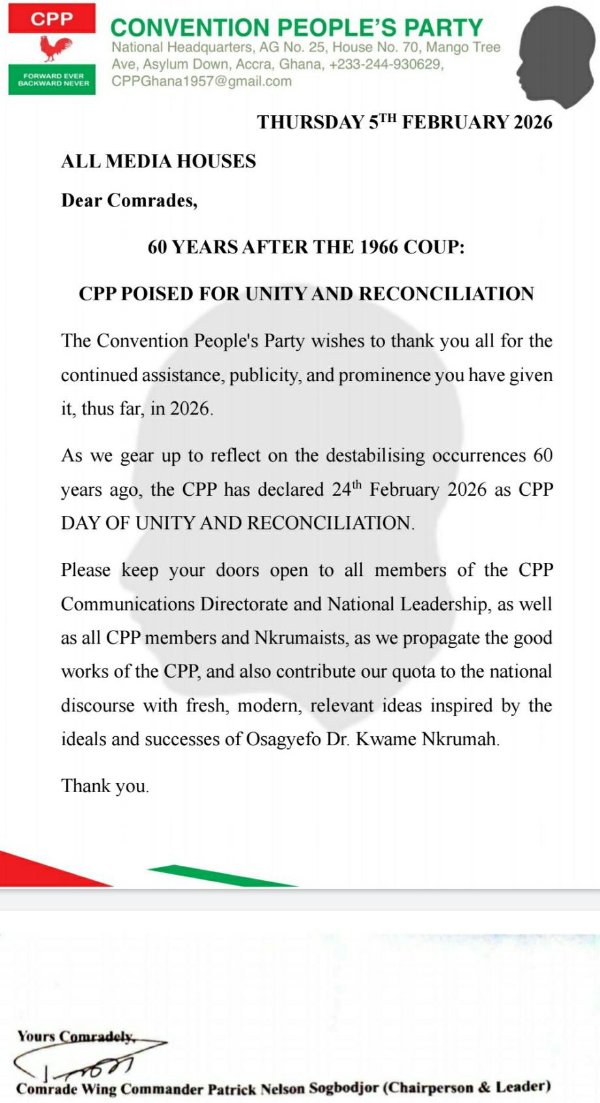 The Convention People's Party (CPP) has proclaimed February 24 as a Day of Unity and Reconciliation, marking sixty years since the 1966 coup.