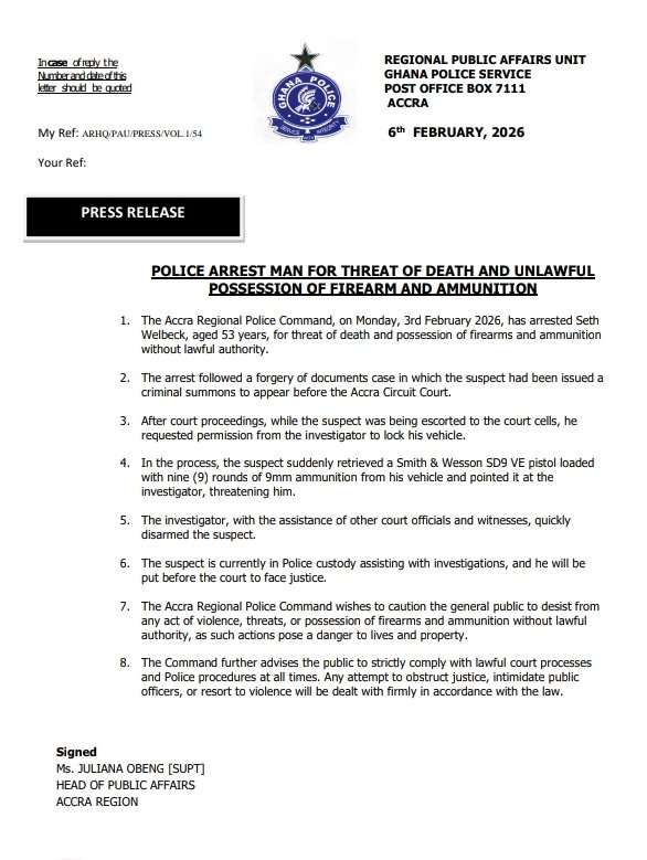 The Accra Regional Police Command arrested Seth Welbeck, aged 53, on Monday, February 3, 2026, for making threats of death and for possessing firearms and ammunition without lawful authority.