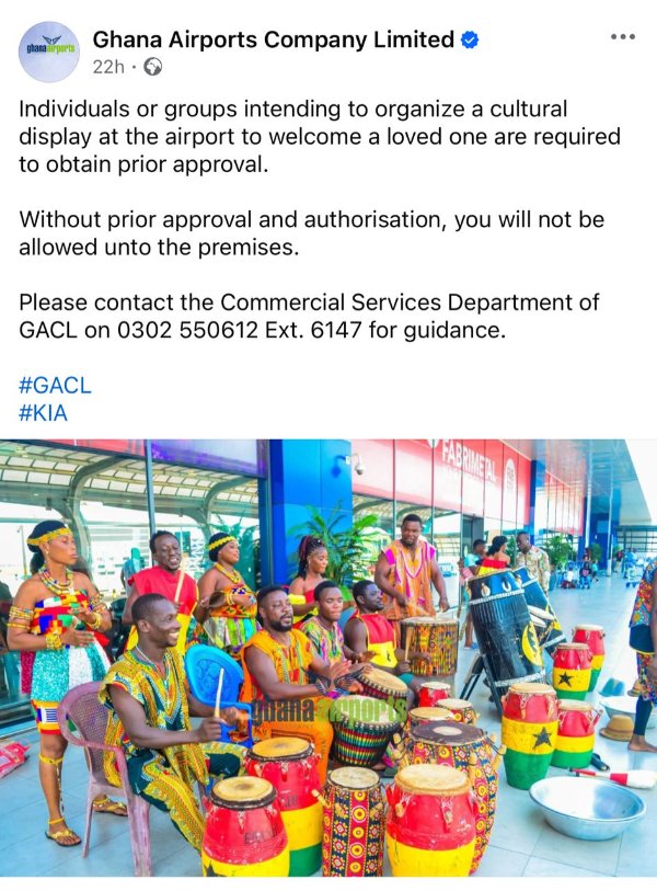 The Ghana Airports Company Limited (GACL) has issued a directive cautioning the public against organising cultural performances at the country’s airports without prior approval from management.