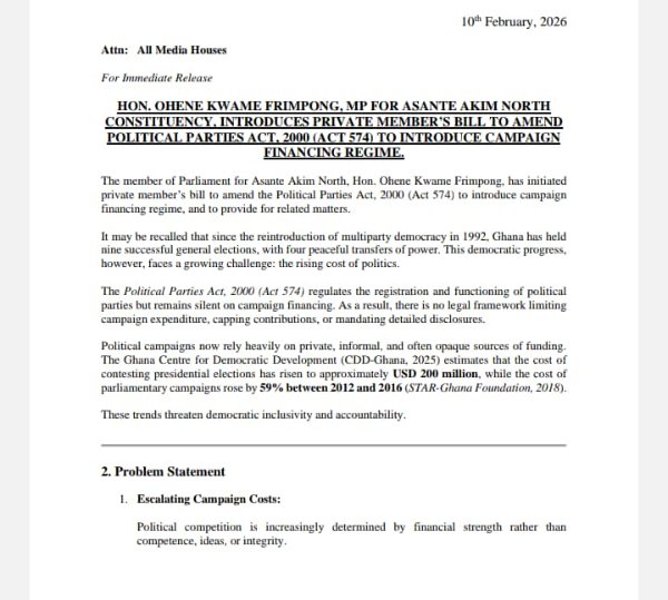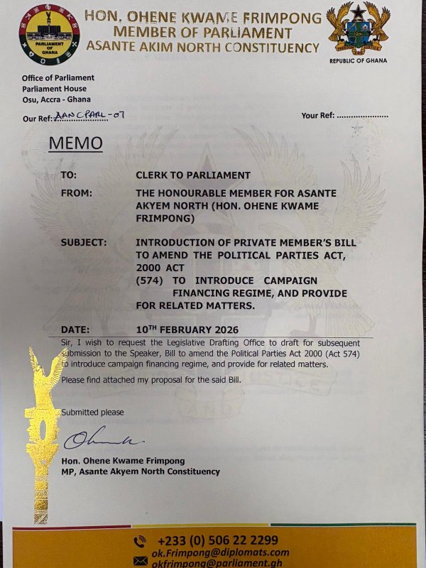 The Member of Parliament (MP) for Asante Akim North, Ohene Kwame Frimpong, has initiated a private member's bill to amend the Political Parties Act, 2000 (Act 574) to introduce a campaign financing regime and to provide for related matters.