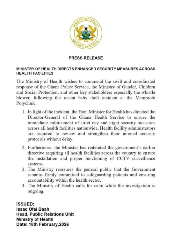 In a release from the Public Relations Unit dated Wednesday, February 18, 2026, Health Minister Kwabena Mintah Akandoh announced that he has instructed the Director‑General of the Ghana Health Service to implement rigorous round‑the‑clock security arrangements at all medical facilities across the country without delay.