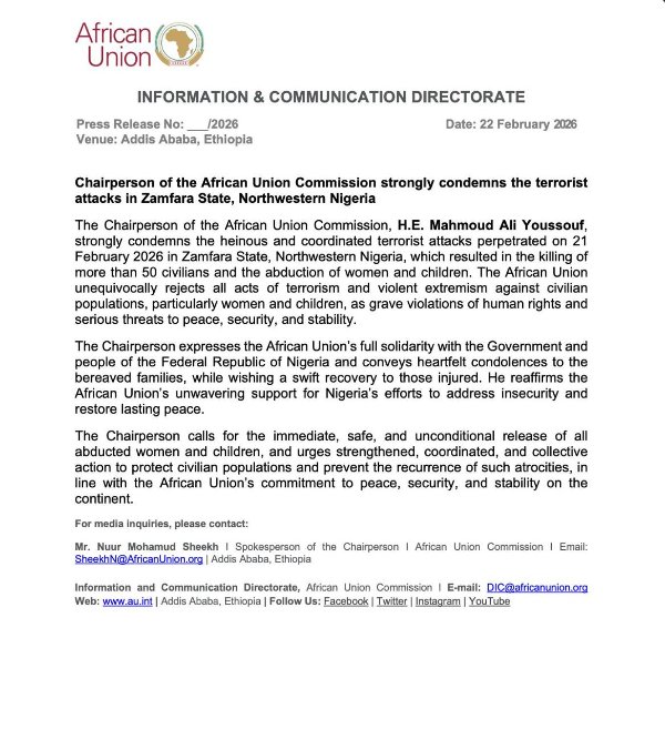 Chairperson of the African Union Commission (AUC), H.E. Mahmoud Ali Youssouf, has strongly condemned the terrorist attacks carried out on February 21, 2026, in Zamfara State, northwestern Nigeria, describing the assault as heinous and coordinated.