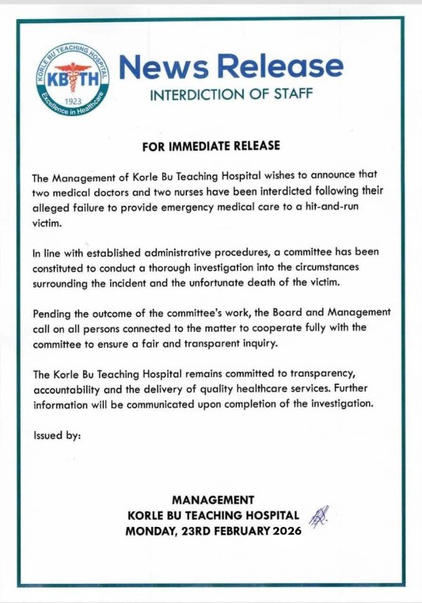 The management of the Korle Bu Teaching Hospital (KBTH) has interdicted two doctors and two nurses due to their failure to provide emergency care to a hit-and-run victim.