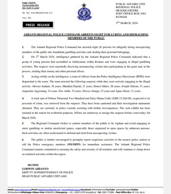 The Ashanti Regional Police Command has arrested eight suspects for allegedly luring and defrauding unsuspecting members of the public through fraudulent gambling activities and the theft of personal belongings.