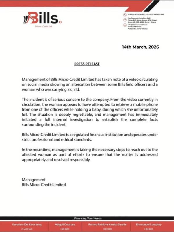 Bills Micro-Credit Limited has announced an internal investigation following a viral video showing an altercation between some of its field officers and a woman carrying a child.