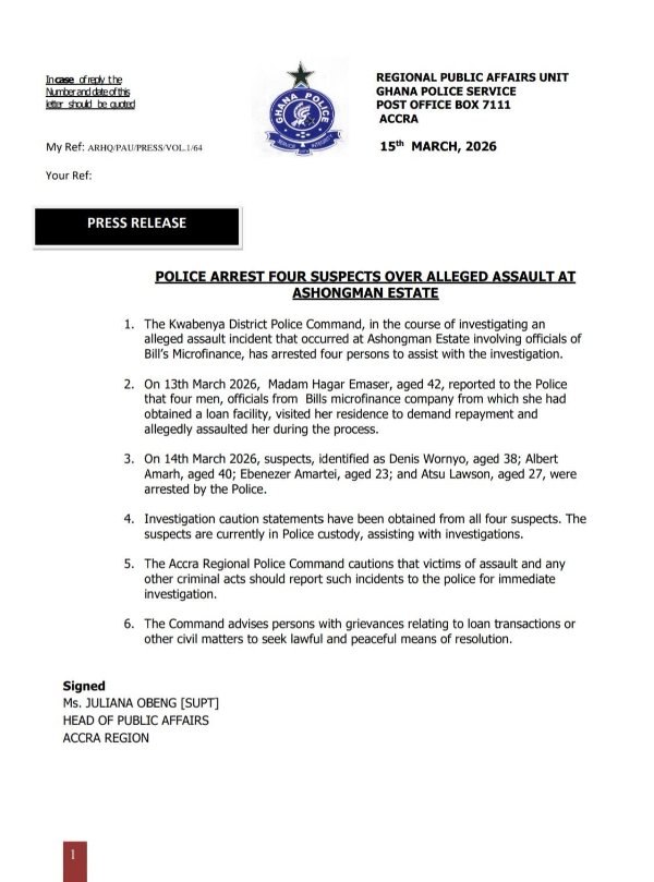 Four individuals have been arrested in connection with an alleged assault incident at Ashongman Estate in Accra, according to the Ghana Police Service.