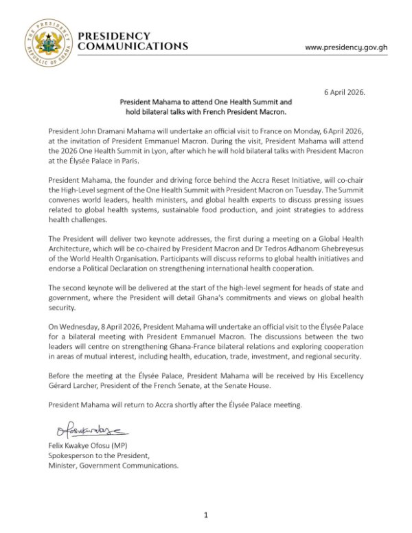 During the visit, President Mahama will attend the 2026 One Health Summit in Lyon, after which he will hold bilateral talks with President Macron at the Élysée Palace in Paris.