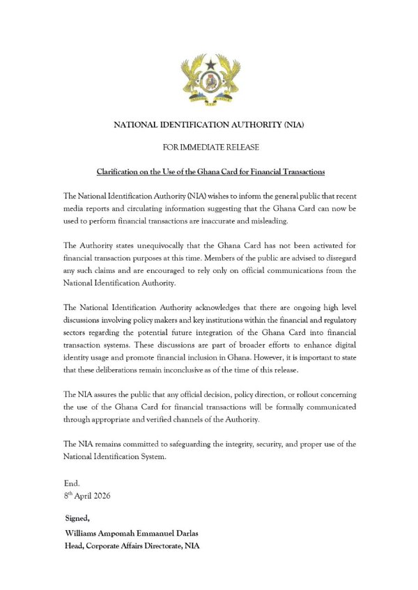 In a statement signed by the Head of Corporate Affairs Directorate, Williams Ampomah Emmanuel Darlas, the Authority stressed that the Ghana Card has not been activated for any financial transaction purposes.