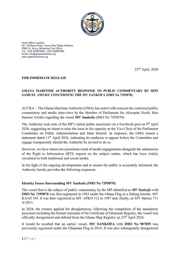 The Ghana Maritime Authority (GMA) has debunked what it describes as false and misleading claims by Akuapem North Member of Parliament (MP), Samuel Awuku, regarding the vessel MV Sankofa.