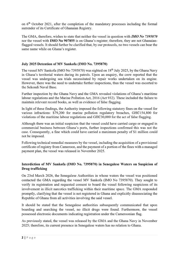 The GMA further clarified that a separate vessel bearing the name MV SANKOFA (IMO No. 907855), registered in 2014, was also duly deregistered in October 2021 following standard regulatory processes. It emphasised that neither vessel is currently flagged under Ghana, adding that Ghana’s maritime protocols do not permit two active vessels to operate under the same name on its registry.