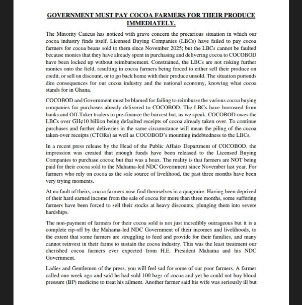 The Minority Caucus in Parliament has raised concerns over what they describe as an impending crisis in Ghana’s cocoa industry, urging the government and the Ghana Cocoa Board (COCOBOD) to promptly resolve outstanding payments owed to cocoa farmers since November 2025.