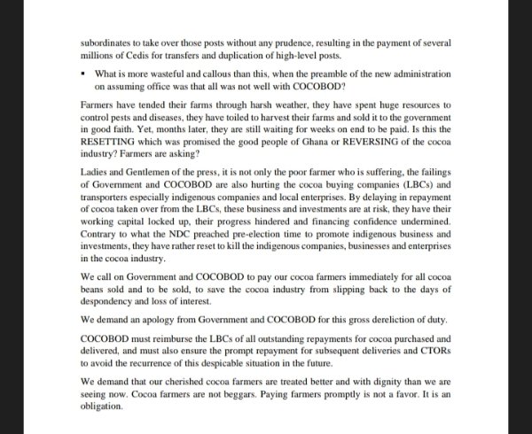 "We call on Government and COCOBOD to pay our cocoa farmers immediately for all cocoa beans sold and to be sold, to save the cocoa industry from slipping back to the days of despondency and loss of interest. We demand an apology from Government and COCOBOD for this gross dereliction of duty.