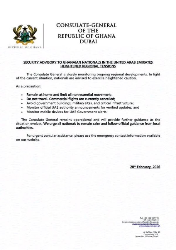 The Consulate-General of the Republic of Ghana in Dubai has issued an urgent security advisory to all Ghanaian nationals residing in the United Arab Emirates due to heightened regional tensions.