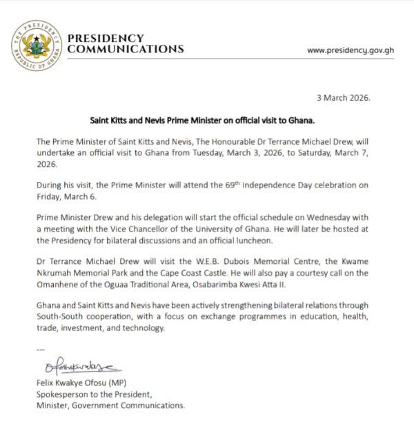 The Prime Minister of Saint Kitts and Nevis, Dr. Terrance Michael Drew, is set to undertake an official visit to Ghana from Tuesday, March 3, 2026, to Saturday, March 7, 2026.