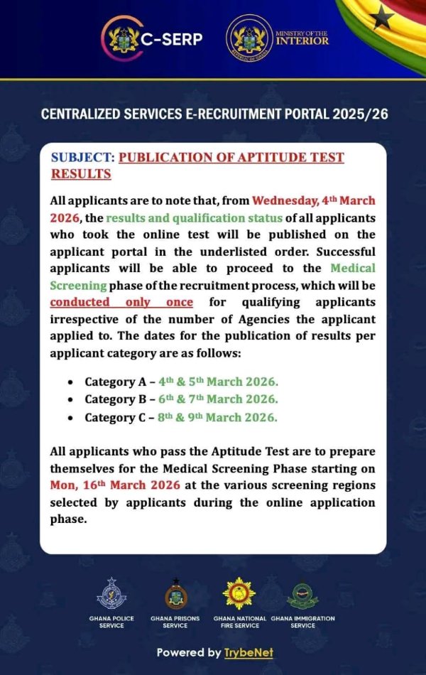 Furthermore, the Ministry stated that all applicants who pass the Aptitude Test should prepare for the Medical Screening Phase, which is scheduled for Monday, March 26, 2026, at the various screening regions selected by applicants during the online application phase.