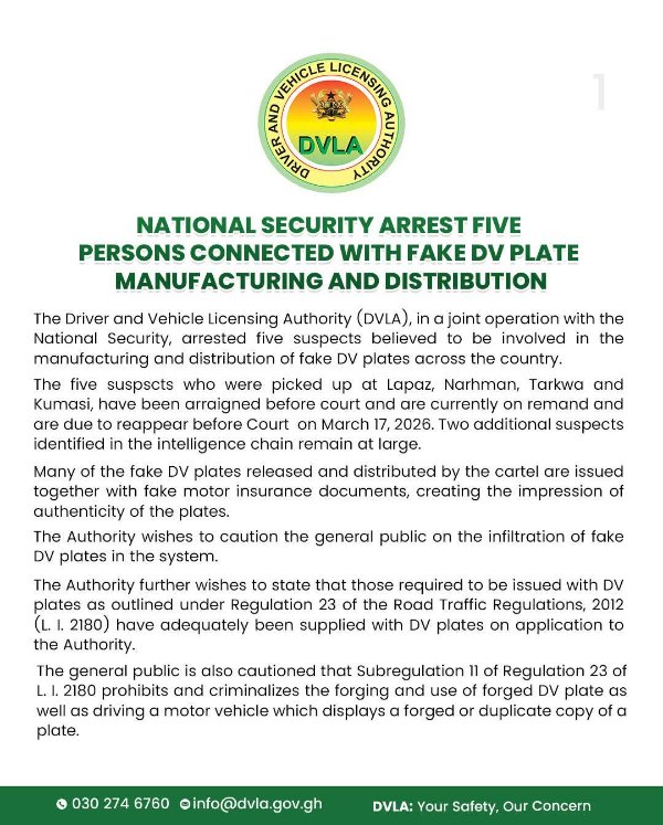 The Driver and Vehicle Licensing Authority (DVLA), in a joint operation with the National Security, has arrested five suspects believed to be involved in the manufacturing and distribution of fake DV plates across the country.