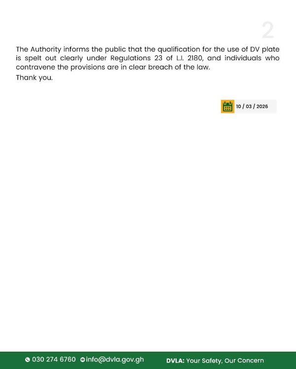 However, it cautioned that Subregulation 11 of Regulation 23 of L.I. 2180 prohibits and criminalises the forging and use of forged DV plates, as well as driving a motor vehicle that displays a forged or duplicate copy of a plate.