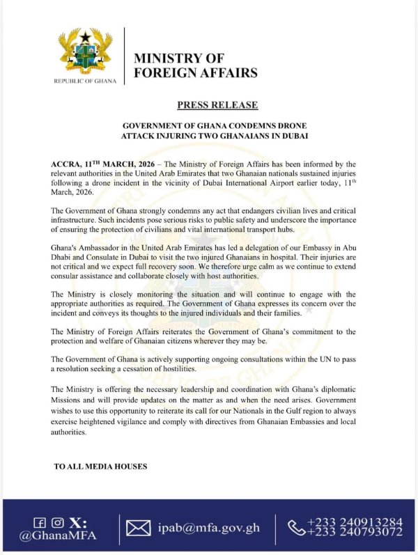 In a press release issued in Accra on March 11, the Ministry stated that it had been informed by relevant authorities in the UAE that the incident occurred earlier in the day in the vicinity of the airport in Dubai.