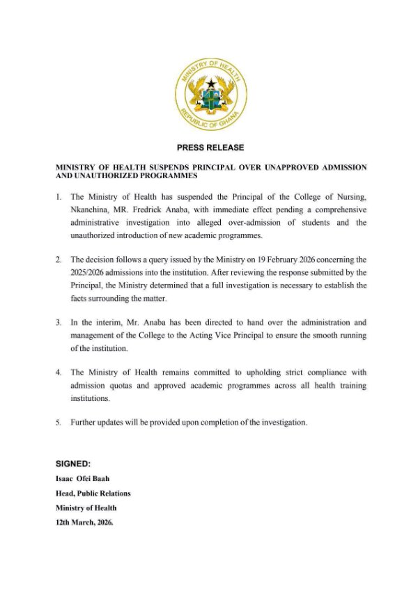 In the interim, the Ministry has directed Mr. Anaba to hand over the administration and management of the College to the Acting Vice Principal to ensure the smooth running of the institution.