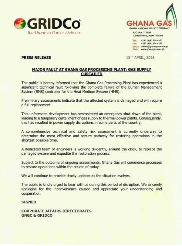 The Ghana National Gas Company has announced an emergency shutdown of its gas processing plant following a major technical failure, a development that has led to power supply disruptions in parts of the country.