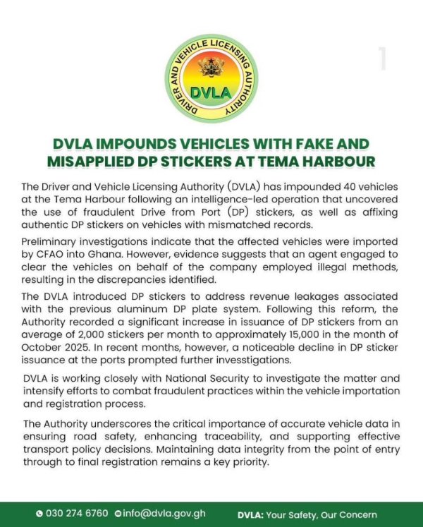 “The Authority recorded a significant increase in the issuance of DP stickers from an average of 2,000 stickers per month to approximately 15,000 in the month of October 2025. In recent months, however, a noticeable decline in DP sticker issuance at the ports prompted further invesstigations” the statement said